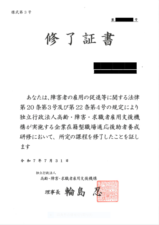 2 0 2 5 年 企業在籍型職場適応援助者(ジョブコーチ)に3名認定